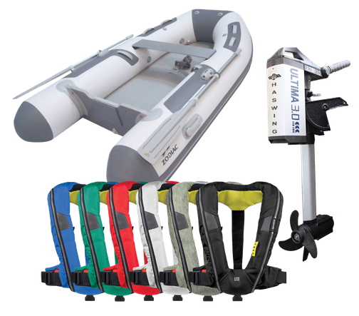 Lusty and Blundell’s Zodiac Kiwi Summer Explorer Packs, consisting of a Zodiac Cadet Aero inflatable, Haswing Ultima electric outboard motor and two Spinlock Deckvest Lite lifejackets are a great way to get on the water.
