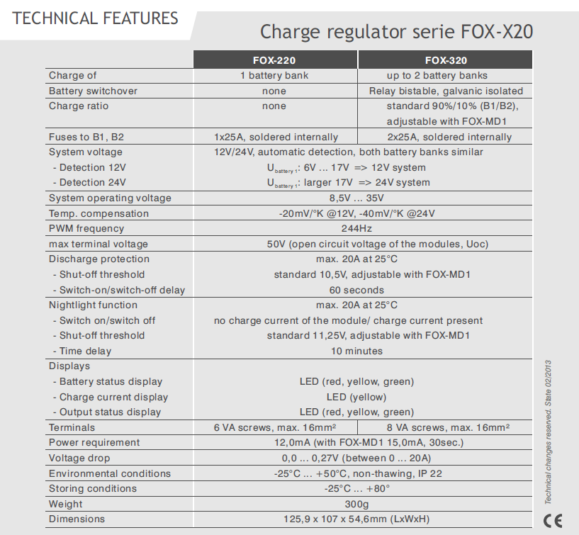The FOX-320 / FOX-220 solar charge regulators are for charging currents up to 20A, suitable for AGM, GEL and lead-acid batteries. With the FOX-220 one battery system can be charged and with the FOX-320 two different battery systems can be charged. The optimized charging characteristic, in combination with the hardware PWM control, results in a considerably faster and more gentle charging of the battery. Hazardous gassing and/or overcharging are safely prevented.
