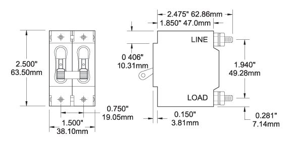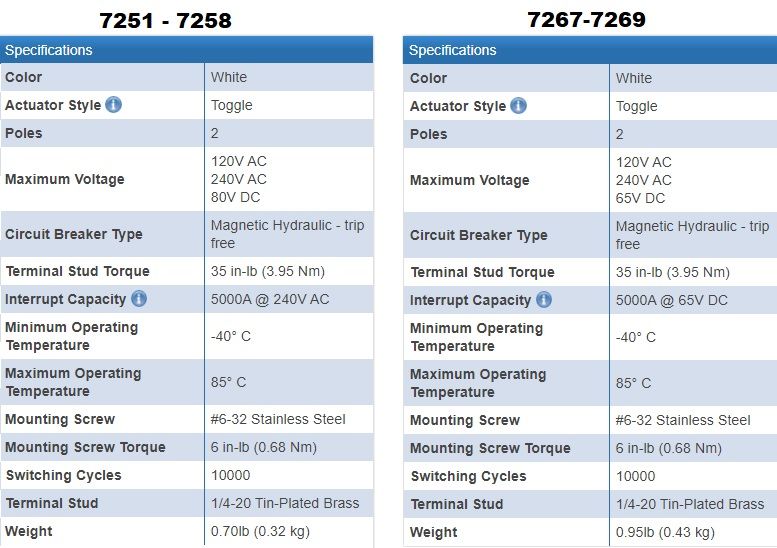 Provides overcurrent protection for inverters, bow thrusters, and windlasses. Combines switching and circuit protection into a single device. Trip Free cannot be held closed after trip.
