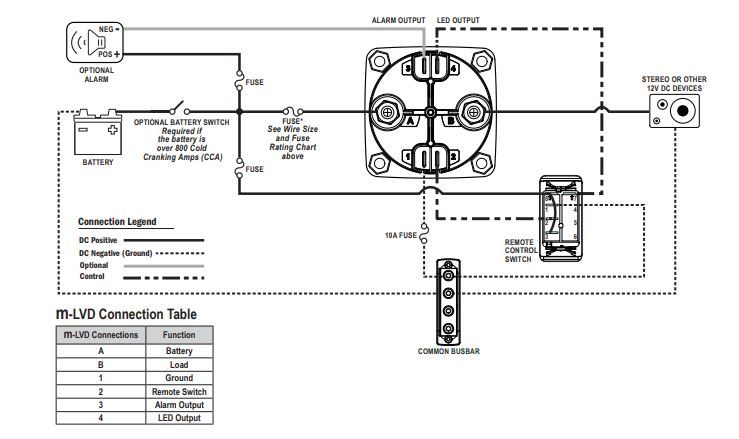 Status light in both m-LVD and Remote Control Switch provides visual warning of low voltage state prior to disconnect. Alarm output available for audible warning of low voltage state prior to disconnect (optional alarm required).
