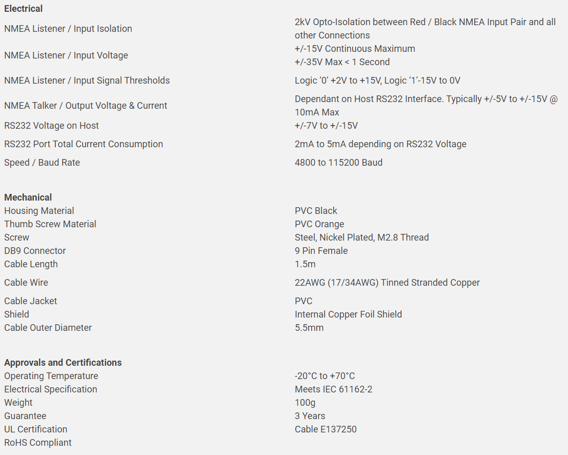 The Actisense OPTO-4 is a bi-directional interface cable which provides a safe and low cost method of connecting your PC to the NMEA 0183 network system to a standard 9-pin port serial port (RS232).