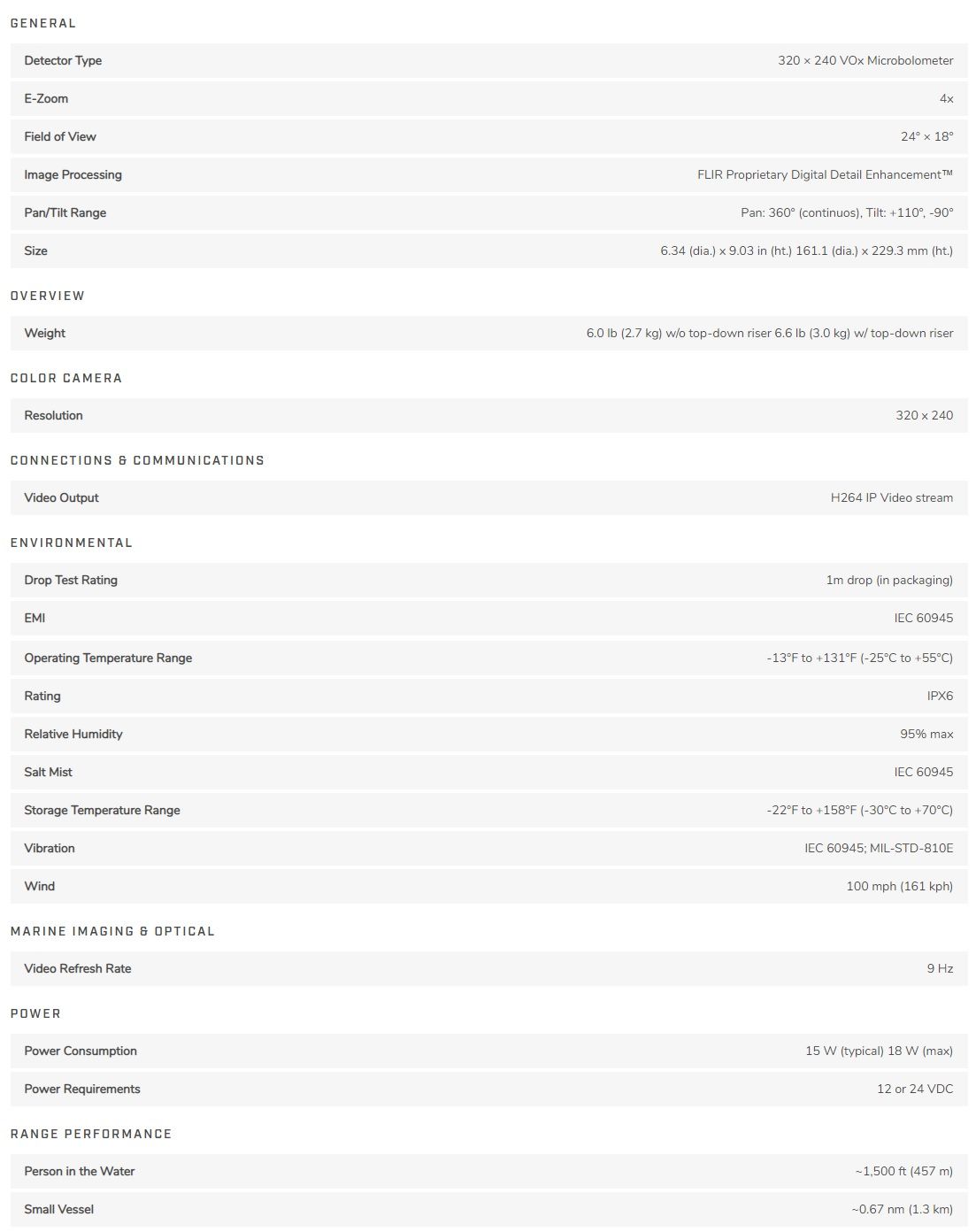 The FLIR M200 series thermal camera is a Pan and Tilt thermal IP camera which turns night to day, keeping you safe when on the water. The M232 can be used to identify objects in the water with different thermal footprints such as debris, vessels, buoys, people or substances like oil in and on the water. One of the added advantages of having thermal imaging is the ability to visualise significant sea temperature breaks and birds on the water that can otherwise be missed by radar, whilst identifying breaching whales, dolphins and gamefish.